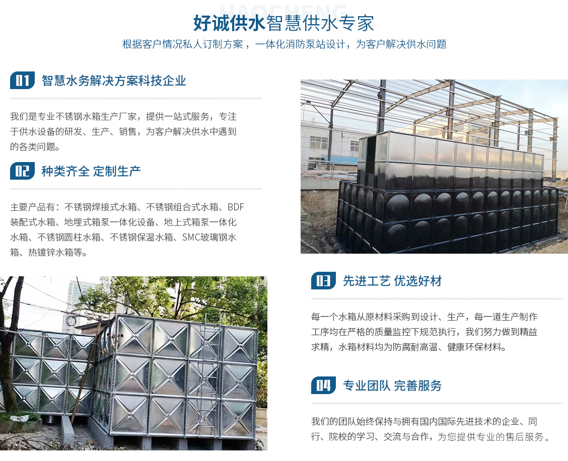安徽好誠供水設(shè)備制造有限公司是一家集設(shè)計、研發(fā)、制造、銷售、售后為一體的專業(yè)不銹鋼水箱生產(chǎn)廠家,以科技力量立足于社會。近幾年來致力于供水設(shè)備、水箱的研究與開發(fā)。主要產(chǎn)品有:不銹鋼焊接式水箱、不銹鋼組合式水箱、BDF裝配式水箱、地埋式箱泵一體化設(shè)備、地上式箱泵一體化水箱、不銹鋼圓柱水箱、不銹鋼保溫水箱、SMC玻璃鋼水箱、熱鍍鋅水箱。對于傳統(tǒng)混凝土水箱的改造(即不銹鋼內(nèi)貼水箱),老舊水箱的拆除、更換、...